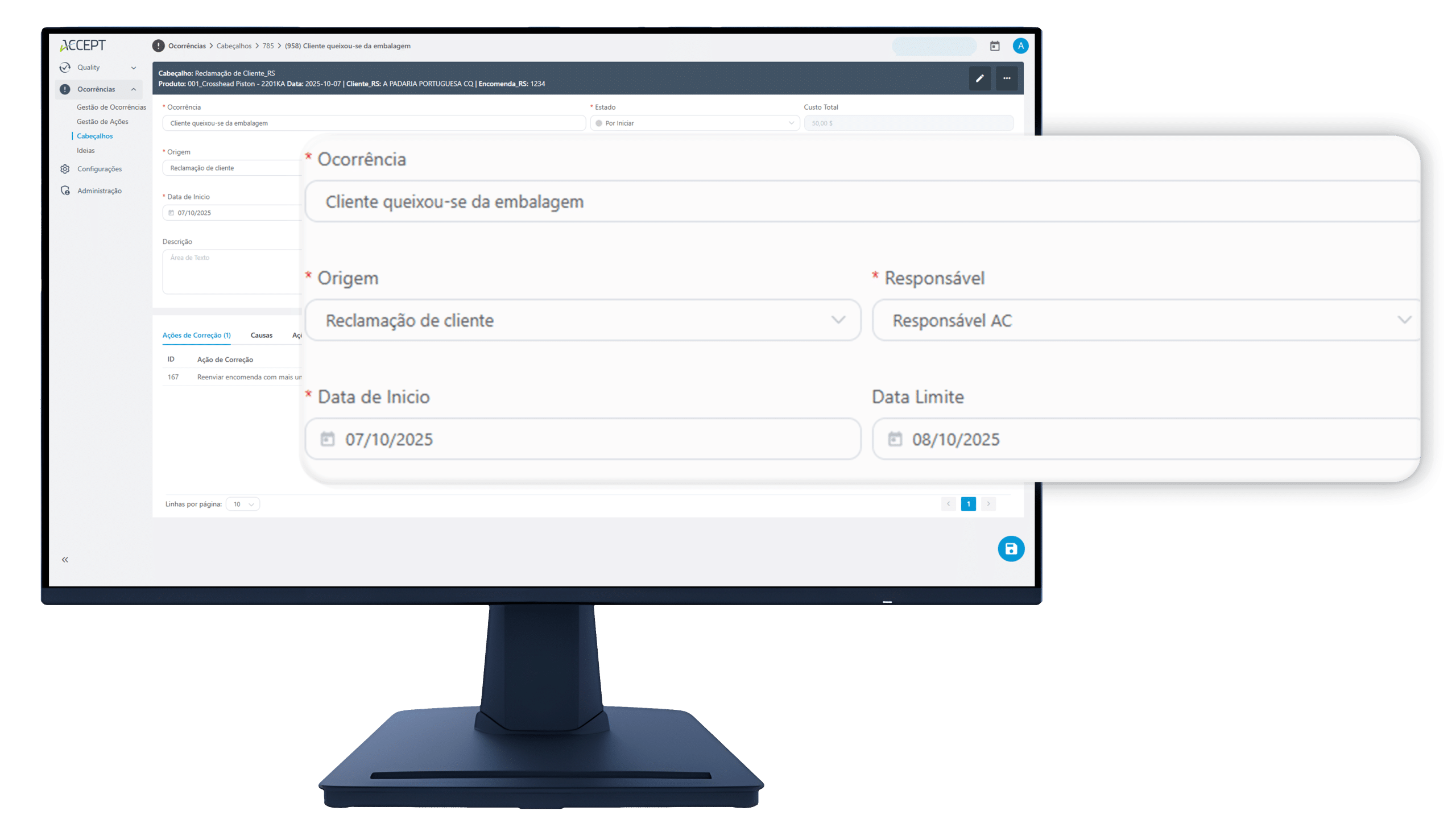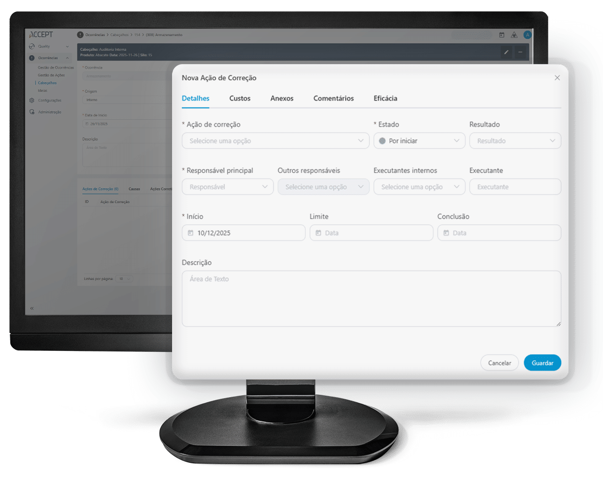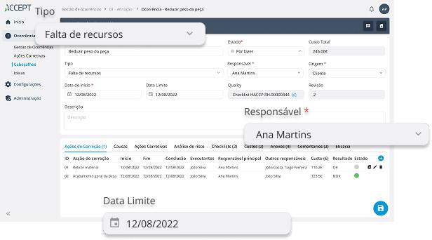 Defina datas limite, responsáveis, áreas, prioridades e ações corretivas para cada ocorrência, com total visibilidade do progresso.