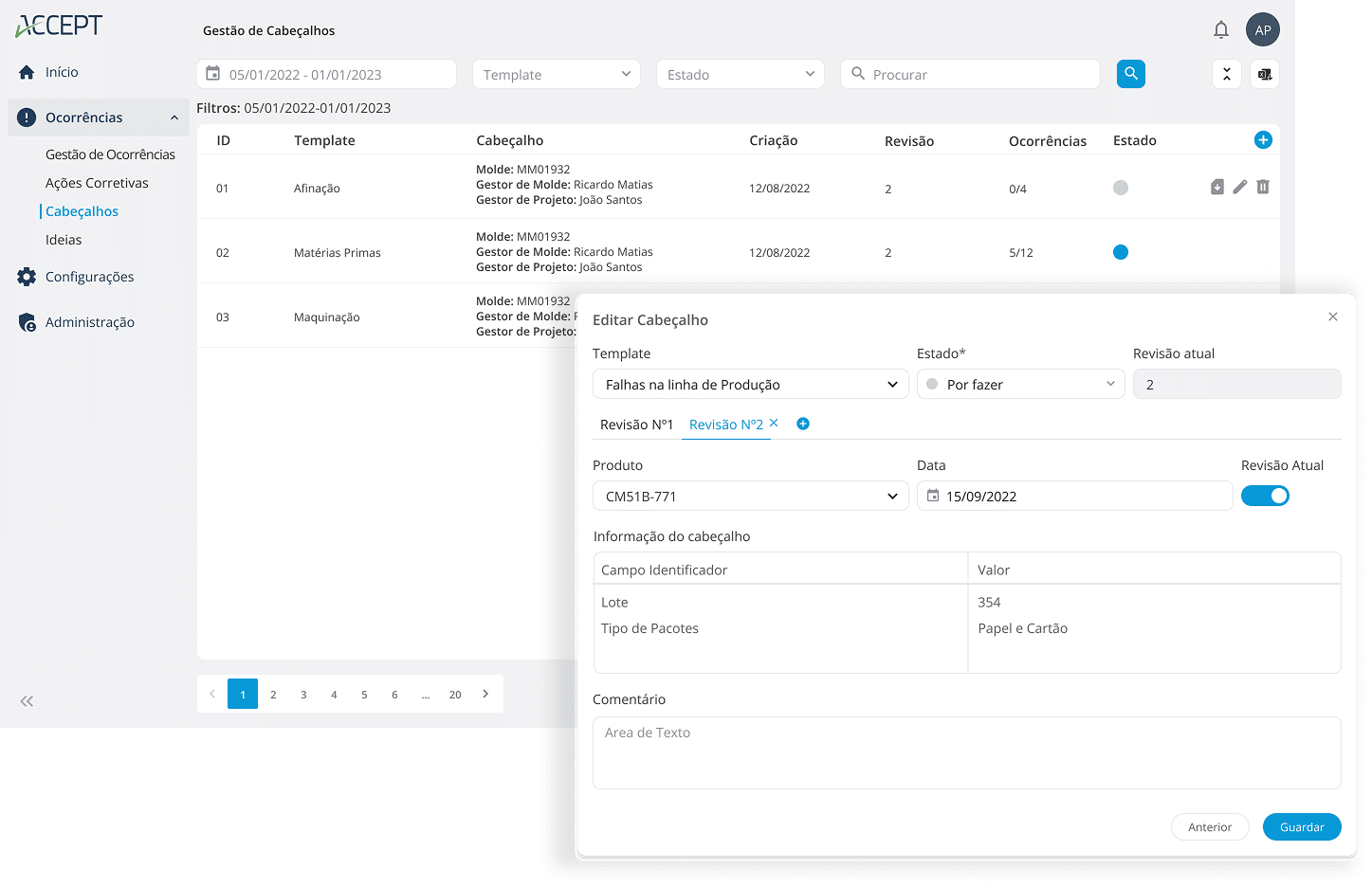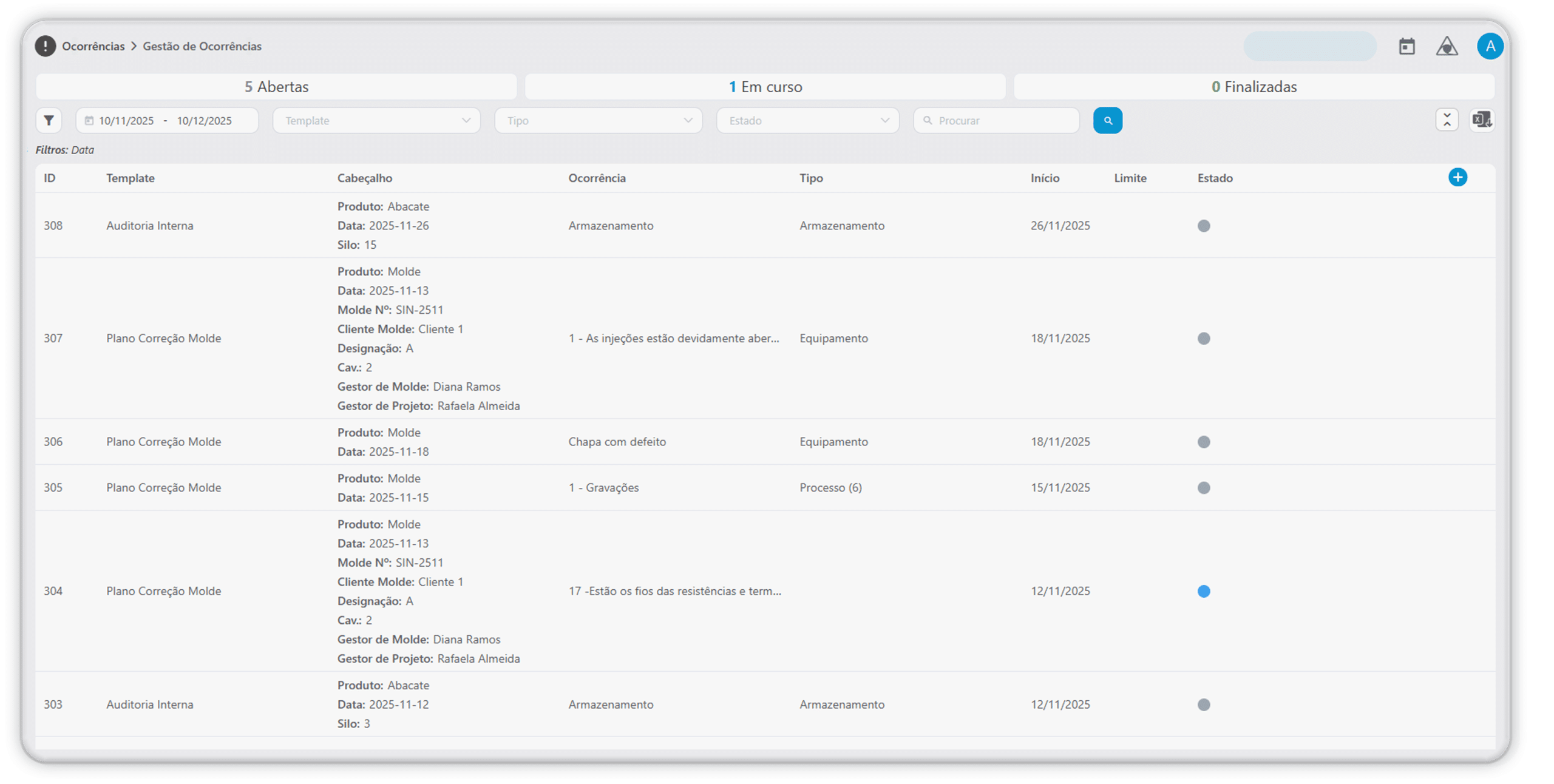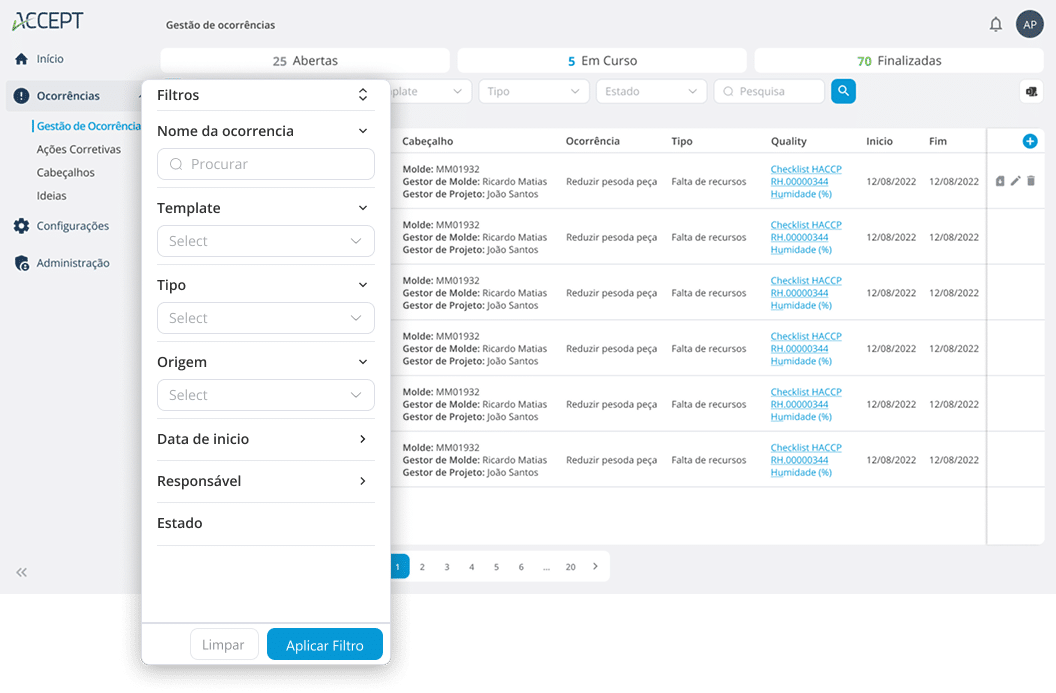 Aceda a todas as ocorrências numa única interface, com filtros, estados e indicadores que facilitam consultas e análise.