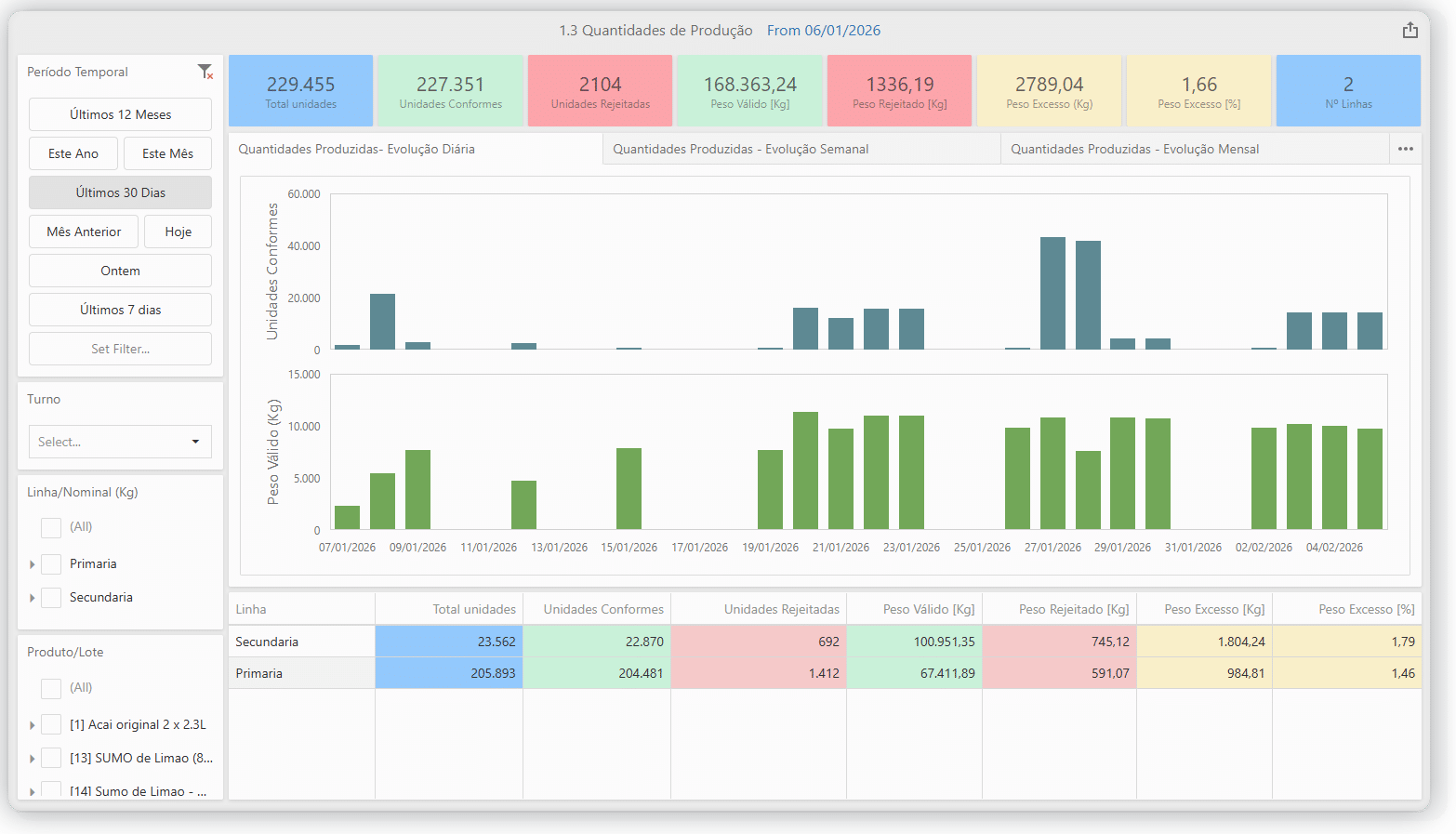Acompanhe o comportamento das linhas por dia, semana ou mês, com visibilidade total sobre tendências, desvios e resultados.