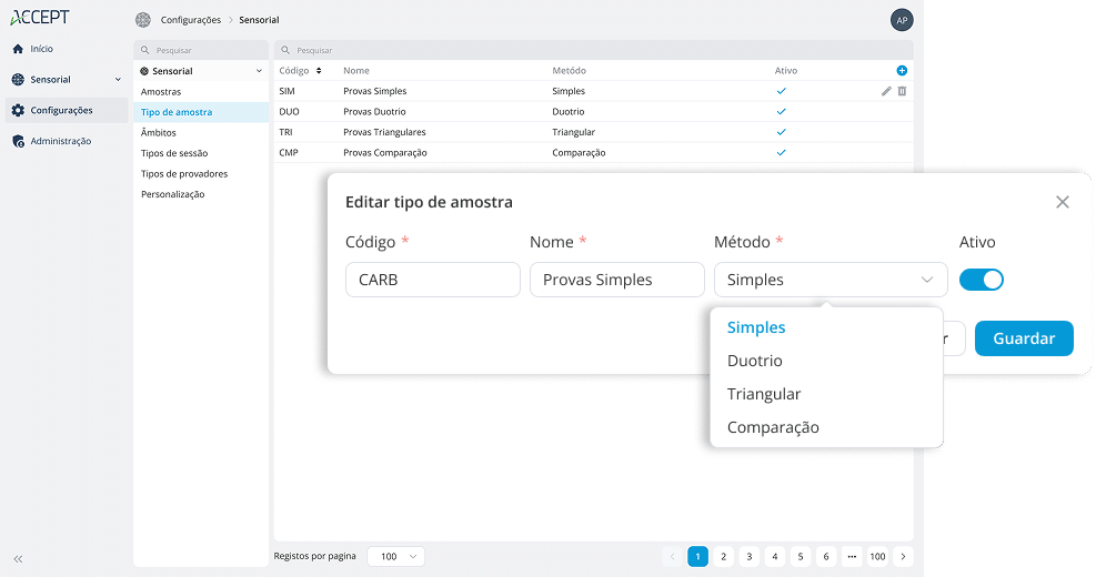 duo-trio e comparativos. - Metodologias configuradas de acordo com o painel, produto e objetivo da avaliação.