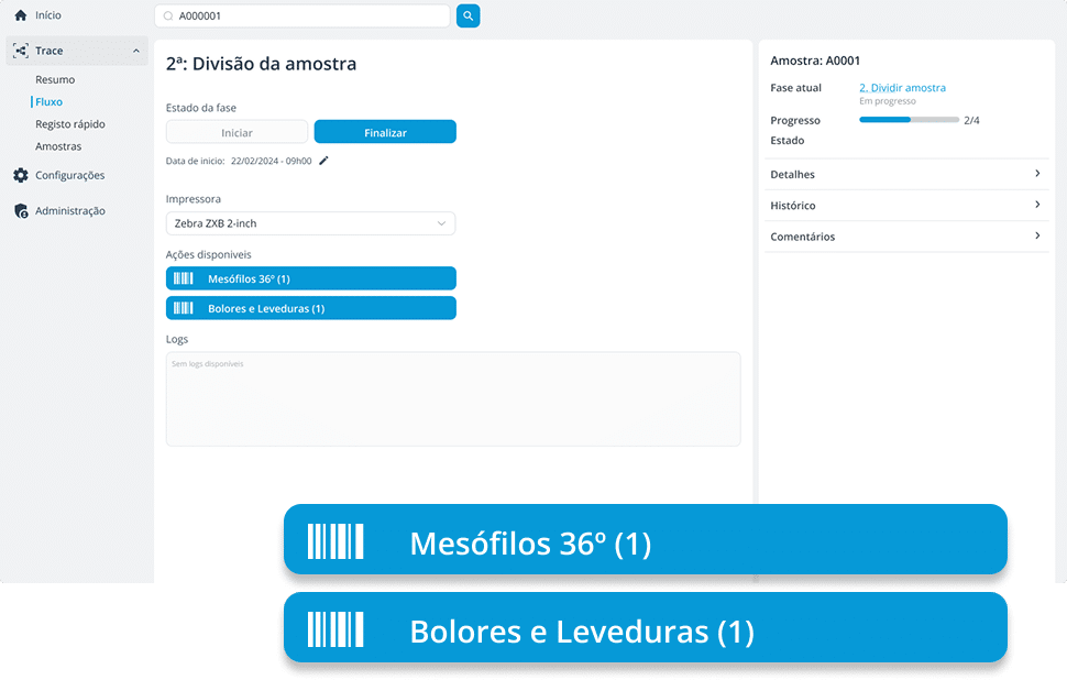 • Impressão de etiquetas para cada etapa, assegurando identificação