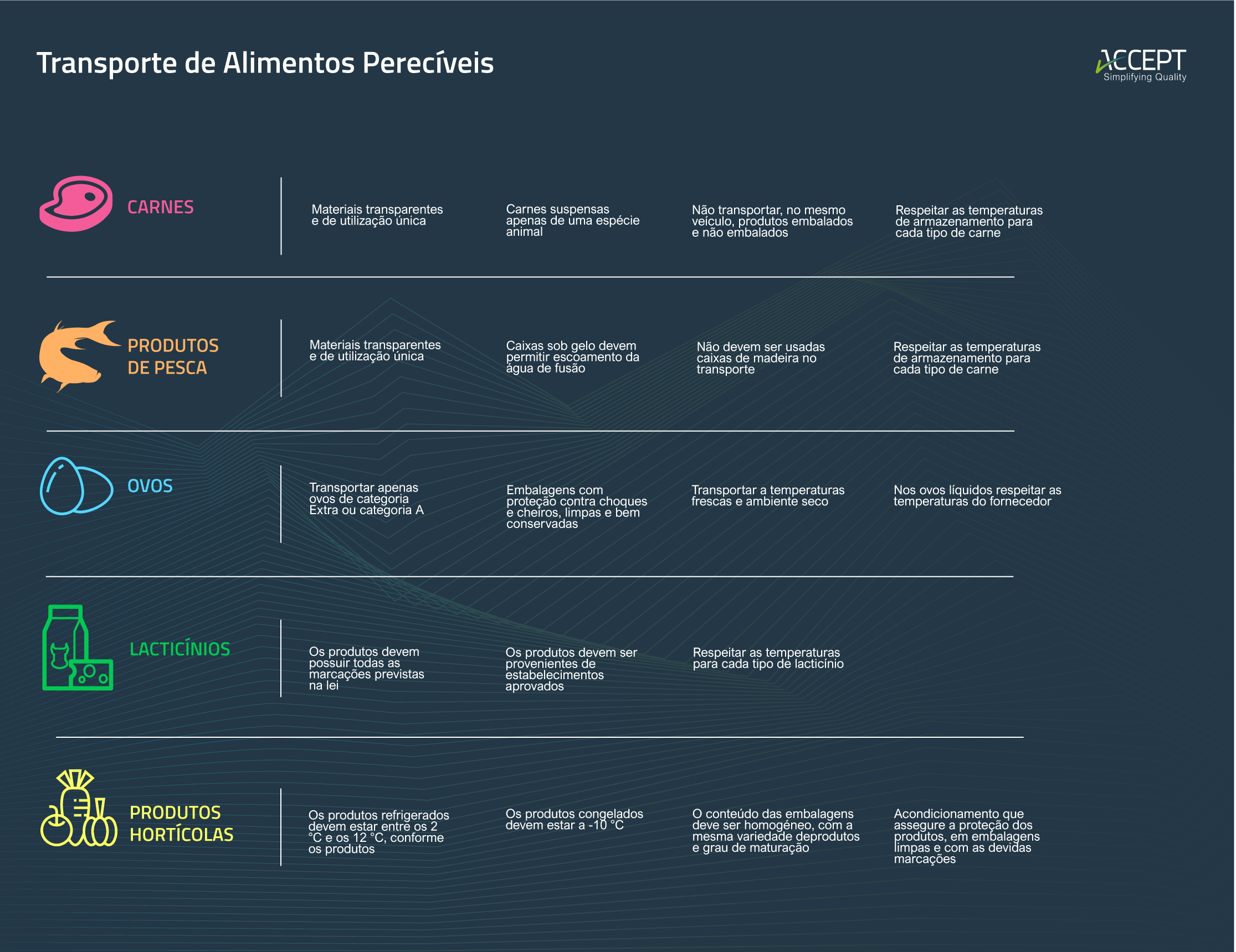 Os alimentos perecíveis devem sempre ser transportados em condições de baixas temperaturas. Possuem um alto teor de água e não possuem fatores intrínsecos que sejam inibidores de desenvolvimento bacteriano, daí que se deteriorem com tanta facilidade.